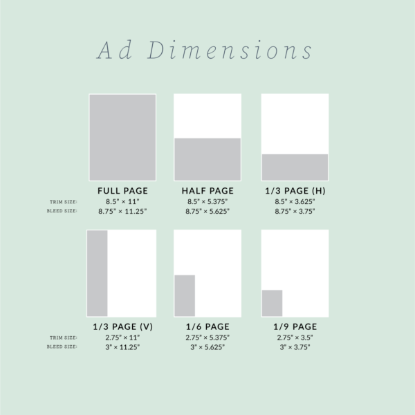 Please review deadlines, ad specifications, submission guidelines below prior to purchase. Advertising is subject to approval at the discretion of SageMint LLC. If you have any questions, contact us.
